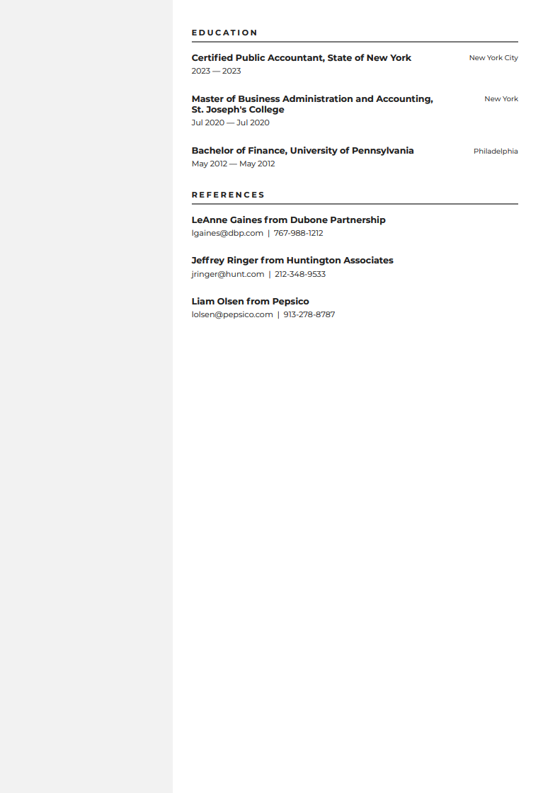 In the above example of an accountant resume, the applicant has extensive experience that necessitates adding a second page. Especially when your resume includes specific accomplishments and metrics, you may need more space to convey all of the important information.