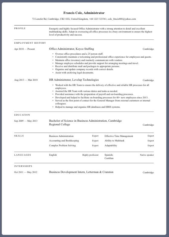 The London template offers a classic structure designed to showcase your years of experience. Its clean, modern design makes it ideal for administrators and other professionals with a meticulous attention to detail.