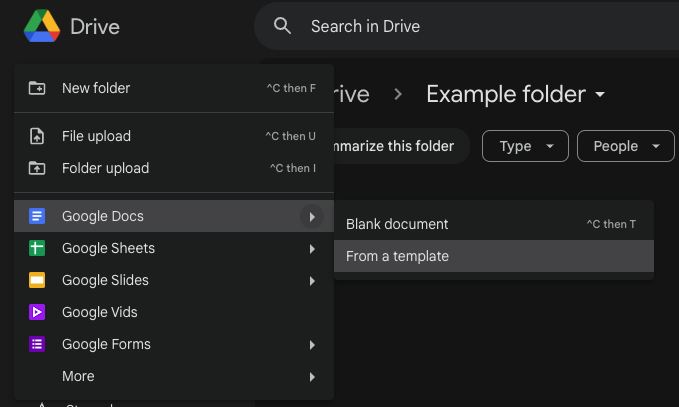 2. Scroll down to “Google Docs” and hover over the arrow. Select “From a template.”