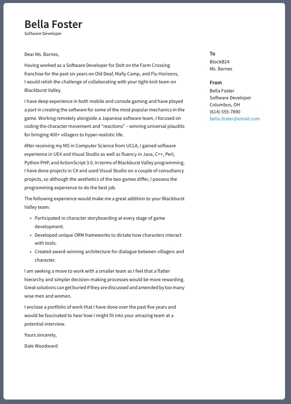 - Different templates and styles: With a cover letter builder, you can easily switch between different templates and styles without losing your work. It allows you to compare multiple formats and designs to find the one that works best for you.