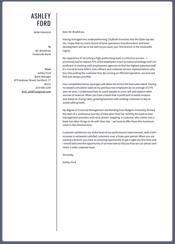 This sleek, monochrome cover letter template has a two-column layout, distinguishing it from other cover letters with traditional formatting. With a structured design, it’s ideal for professionals working in industries like finance, banking, and business management.